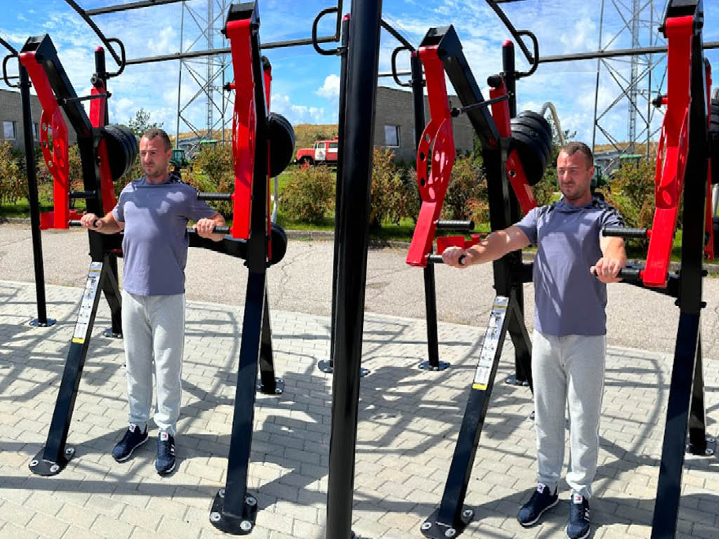 Oefening voor de borstspieren. Gewichten wegdrukken door armen vooruit te strekken en armen weer buigen naar uitgangspositie.